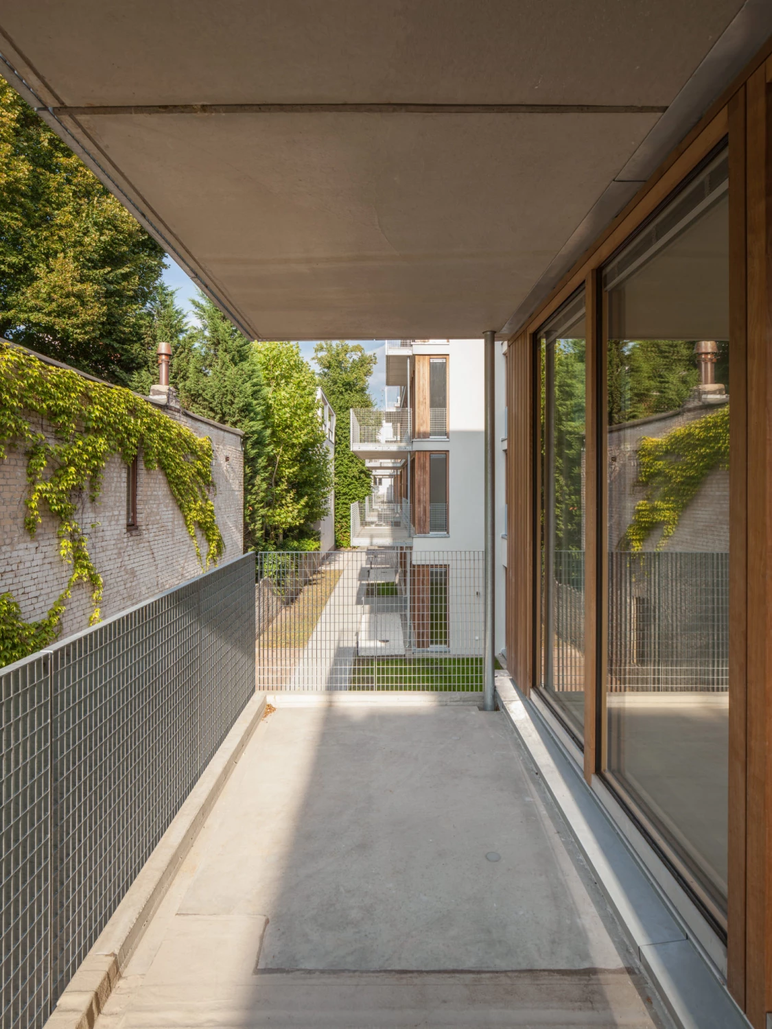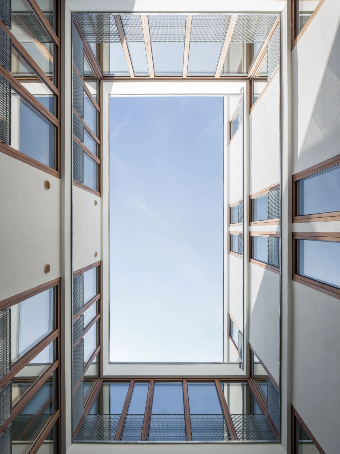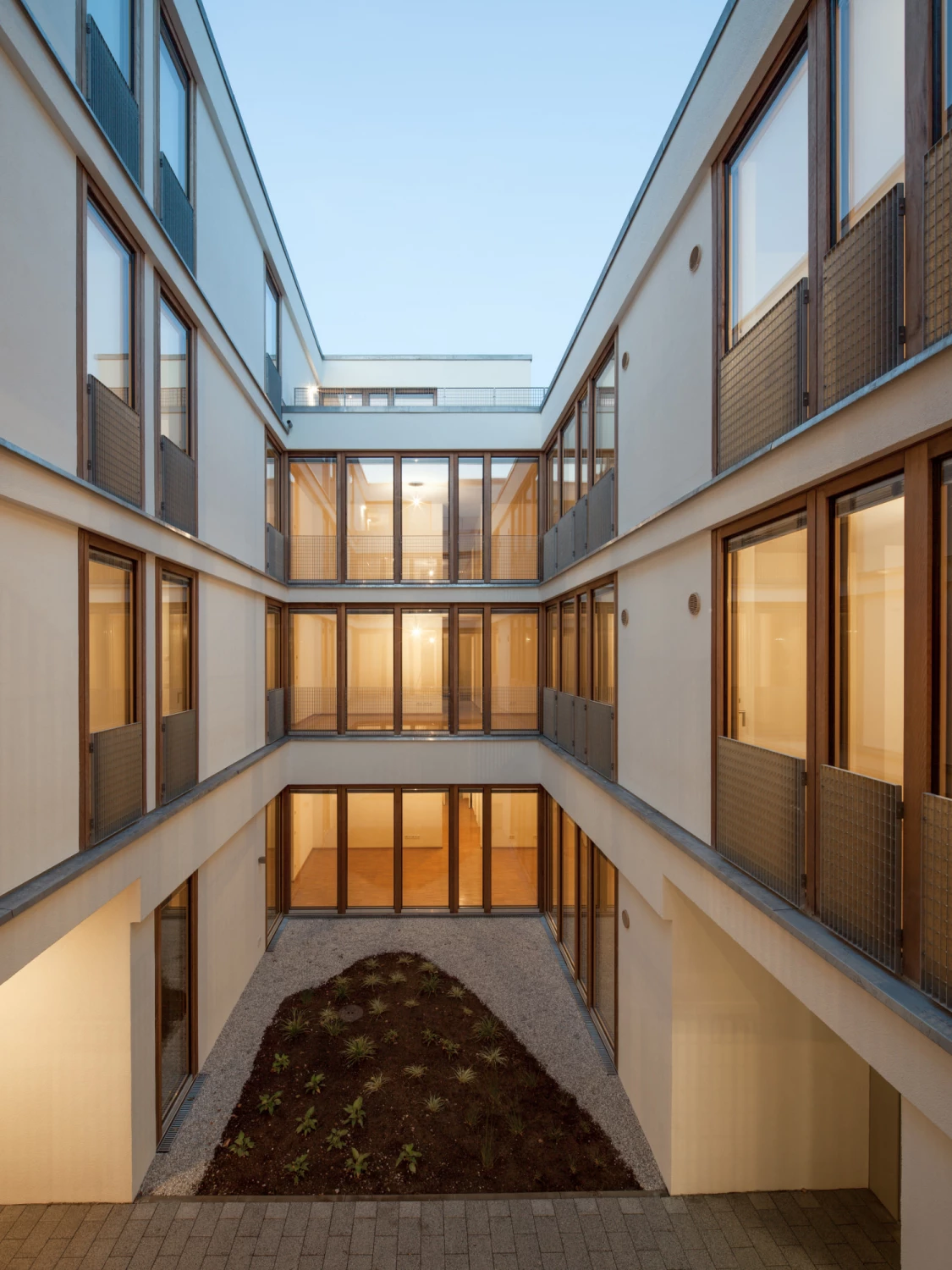 Daher wurden in den Riegel drei Atrien gesetzt, um die sich geschossweise jeweils zwei Wohnungen U-förmig anordnen. Mit baulichen Rücksprüngen wird zudem auf die punktuelle nördliche Nachbarbebauung reagiert, wodurch die Wohnungen zusätzlich von vier Seiten belichtet werden können. Die Wohn- und Essbereiche mit offenen Küchen orientieren sich mit geschosshohen Verglasungen zum Innenhof, während sich die Schlafräume sichtgeschützt mit großzügig gestalteten Balkonen Richtung Norden öffnen.