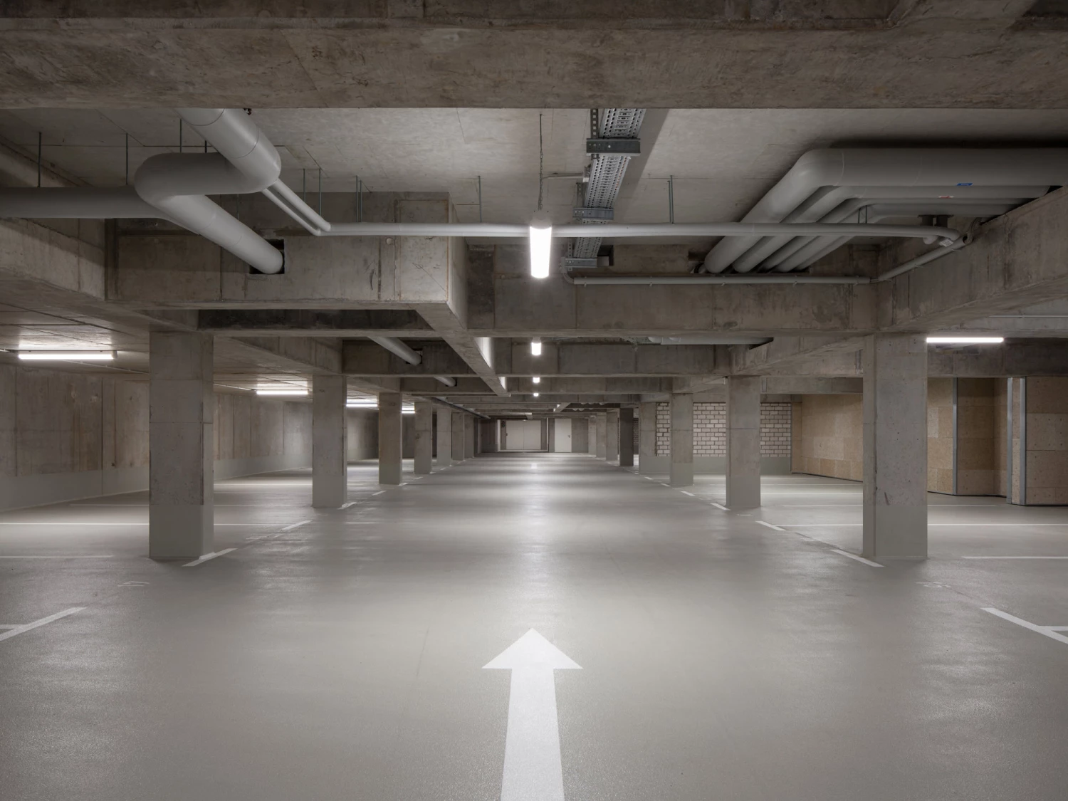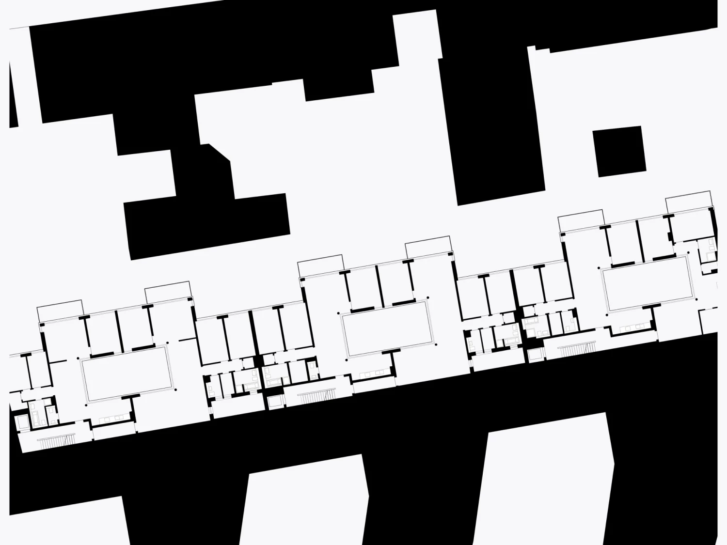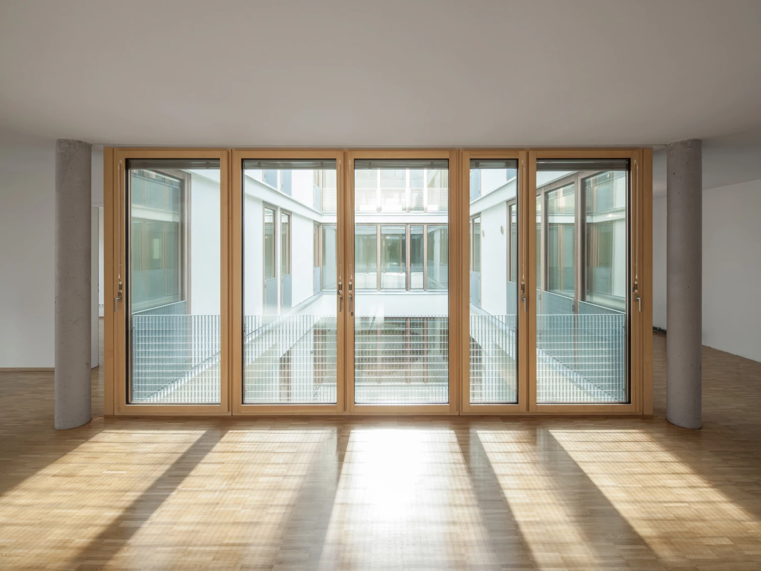 Daher wurden in den Riegel drei Atrien gesetzt, um die sich geschossweise jeweils zwei Wohnungen U-förmig anordnen. Mit baulichen Rücksprüngen wird zudem auf die punktuelle nördliche Nachbarbebauung reagiert, wodurch die Wohnungen zusätzlich von vier Seiten belichtet werden können. Die Wohn- und Essbereiche mit offenen Küchen orientieren sich mit geschosshohen Verglasungen zum Innenhof, während sich die Schlafräume sichtgeschützt mit großzügig gestalteten Balkonen Richtung Norden öffnen.