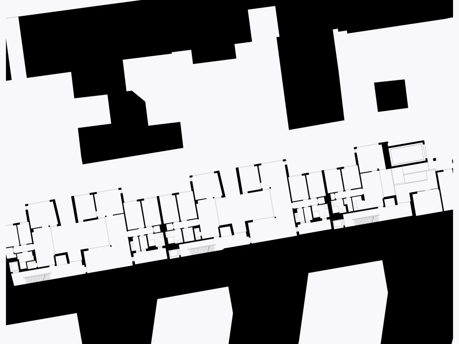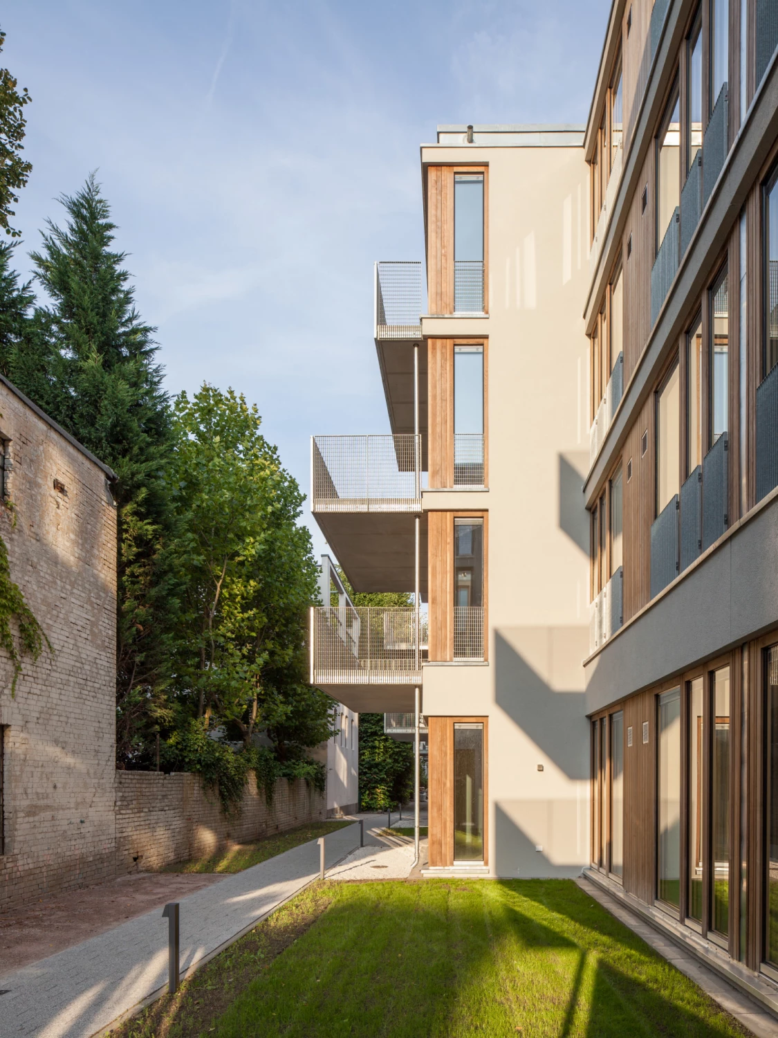 Im Hamburger Stadtteil Ottensen wurde ein kleiner Hinterhof durch einen dreigeschossigen Wohnriegel mit einem Staffelgeschoss nachverdichtet. Größte Herausforderung war hierbei der Umgang mit der schmalen Grundstücksfläche und die angrenzend dichte Nachbarbebauung. Da das Grundstück im Süden darüber hinaus durch eine viergeschossige Brandwand begrenzt wird, galt es hierbei eine Gebäudetypologie zu entwickeln, die trotz der Nordlage optimale Lichtverhältnisse in den 23 Wohnungen schafft.