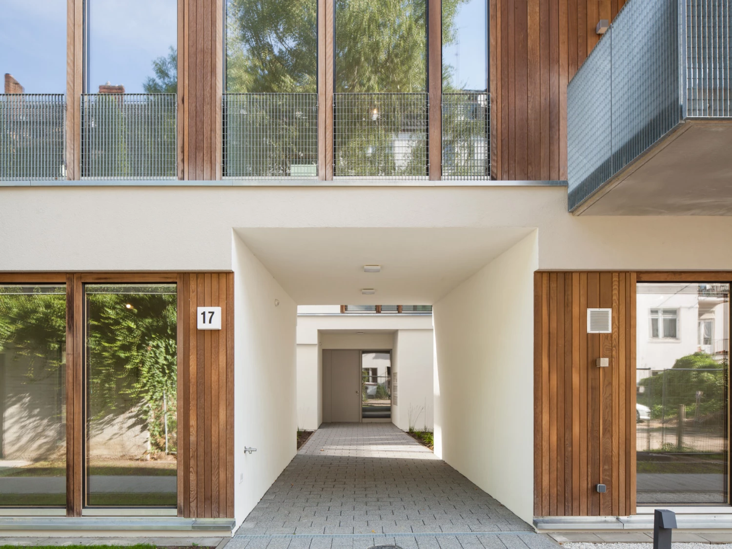 Um die Nachbarbebauung in Material und Farbe auszugreifen, wurde eine helle, lichtreflektierende Putzfassade mit gliedernden Fenster- und Paneelfeldern aus thermisch behandeltem Buchenholz gewählt.