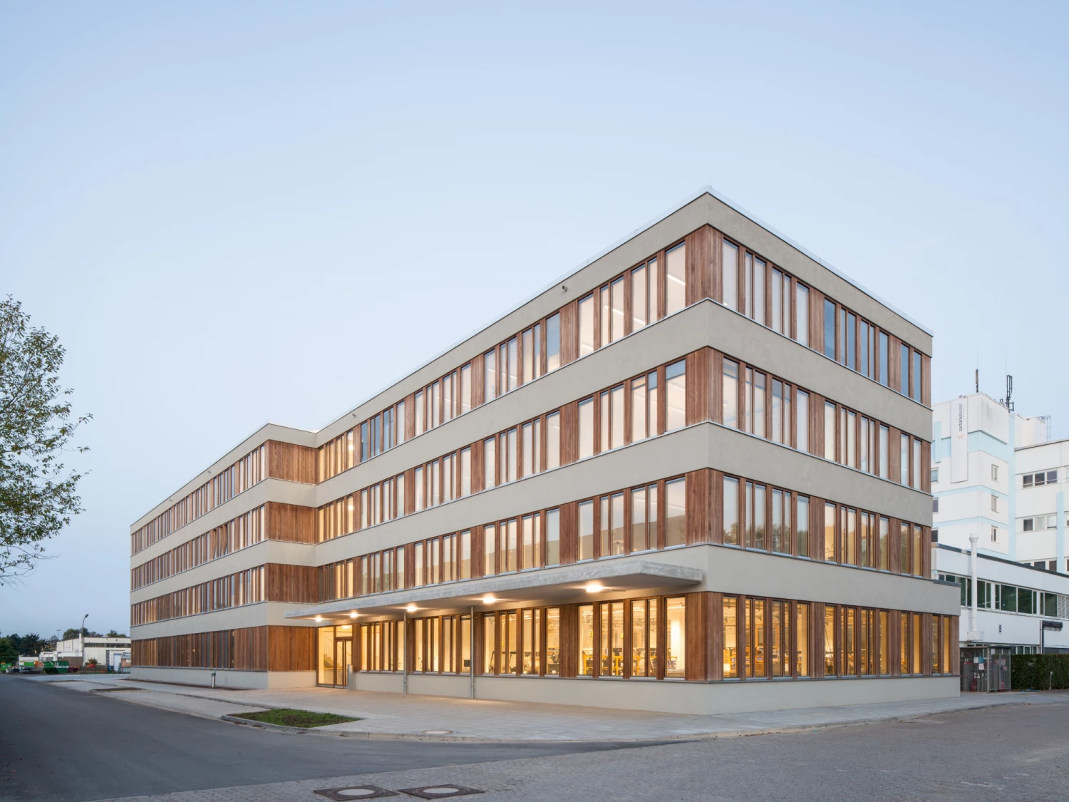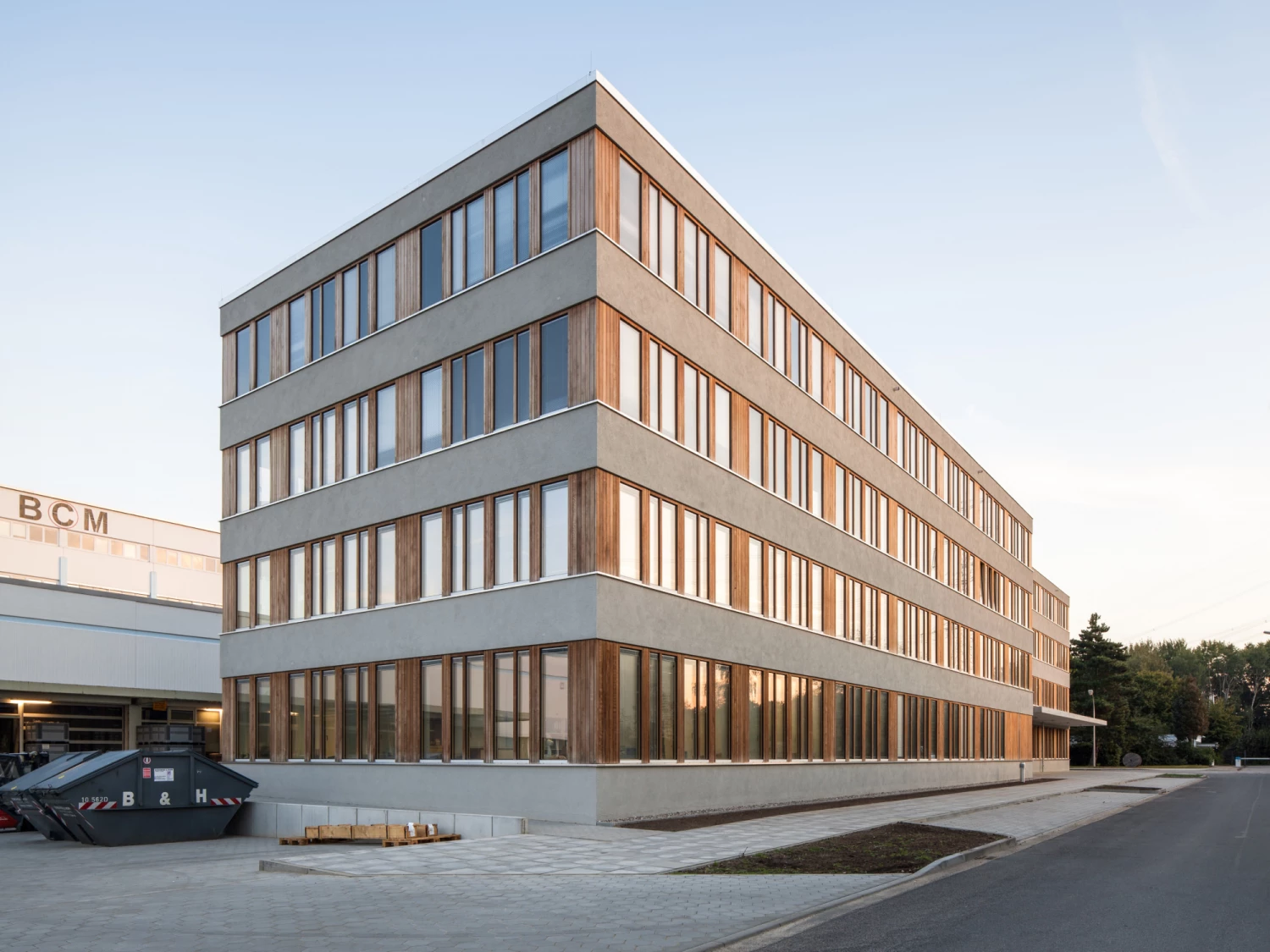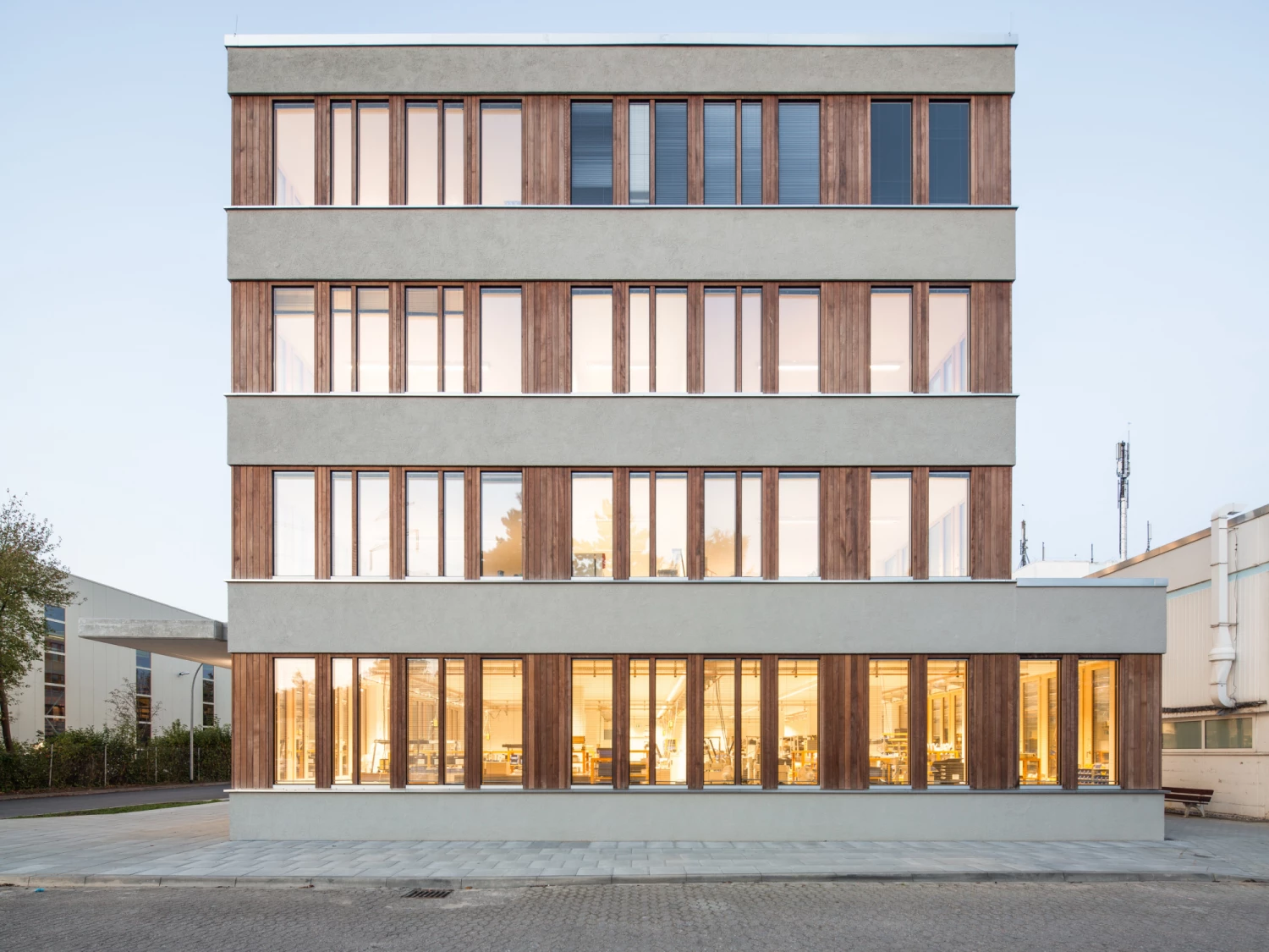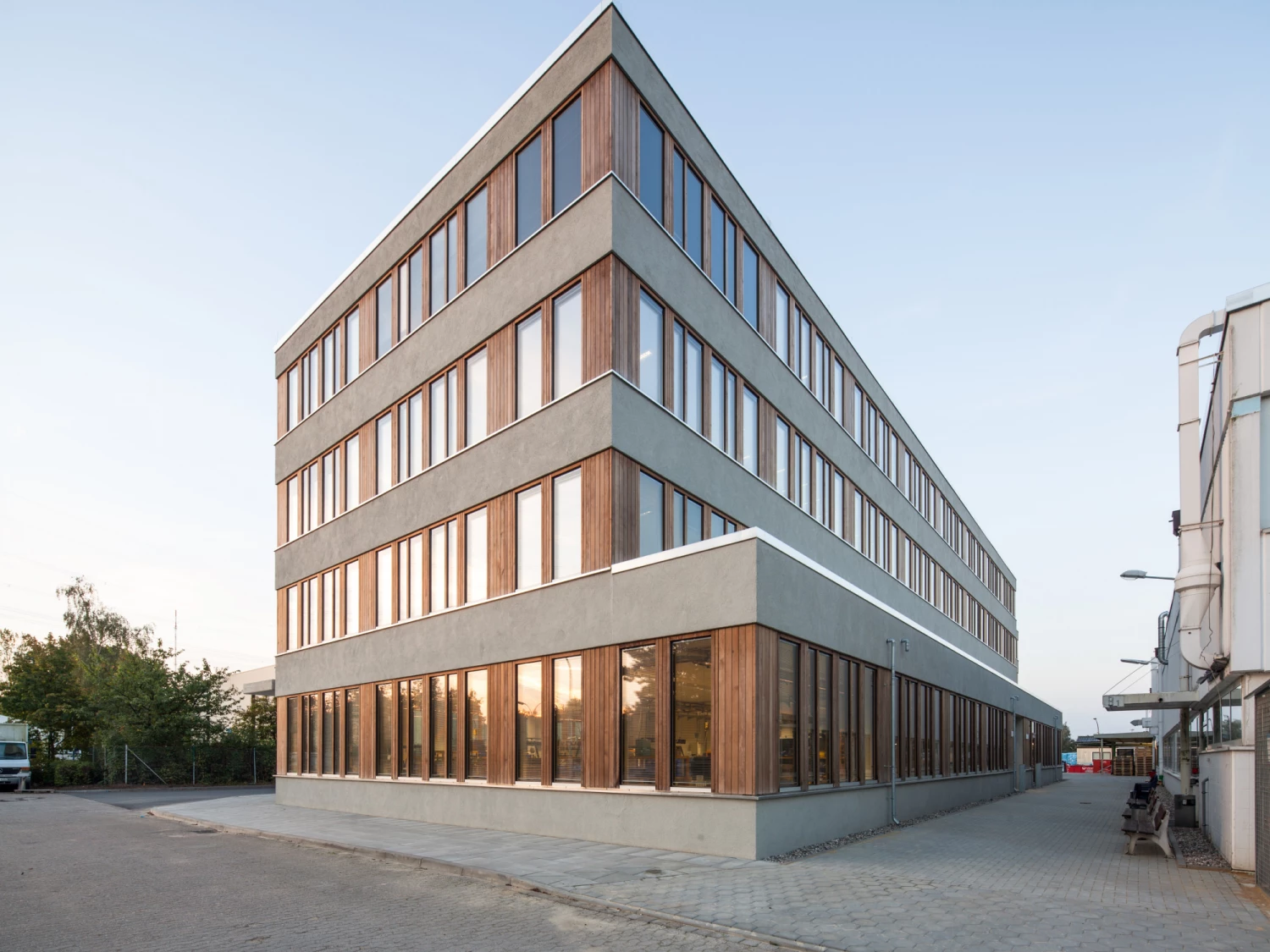 Der viergeschossige Neubau wurde vor die beiden Bestandsbauten platziert und hebt sich durch sein reduziertes Volumen und die für einen Industriebau außergewöhnliche Fassadengestaltung hervor. Der kompakte Charakter findet sich in allen Geschossen wieder: Im Erdgeschoss wurden die Produktionshalle und ein Lager untergebracht, während in den darüber liegenden Geschossen die einzelnen Arbeitsbereiche und die Haustechnik so konzipiert sind, dass eine flexible Neugestaltung der Räume jederzeit möglich ist. Bei der Fassadengestaltung entschied man sich für unbehandeltes Holz im Bereich der Fenster und für hellen Putz.