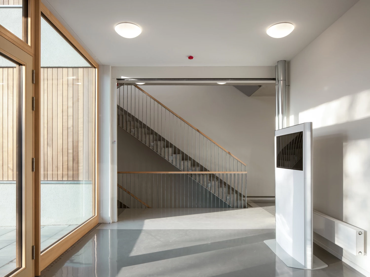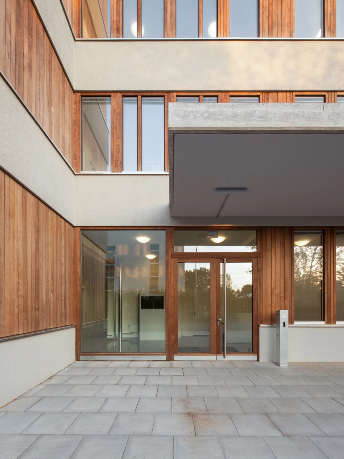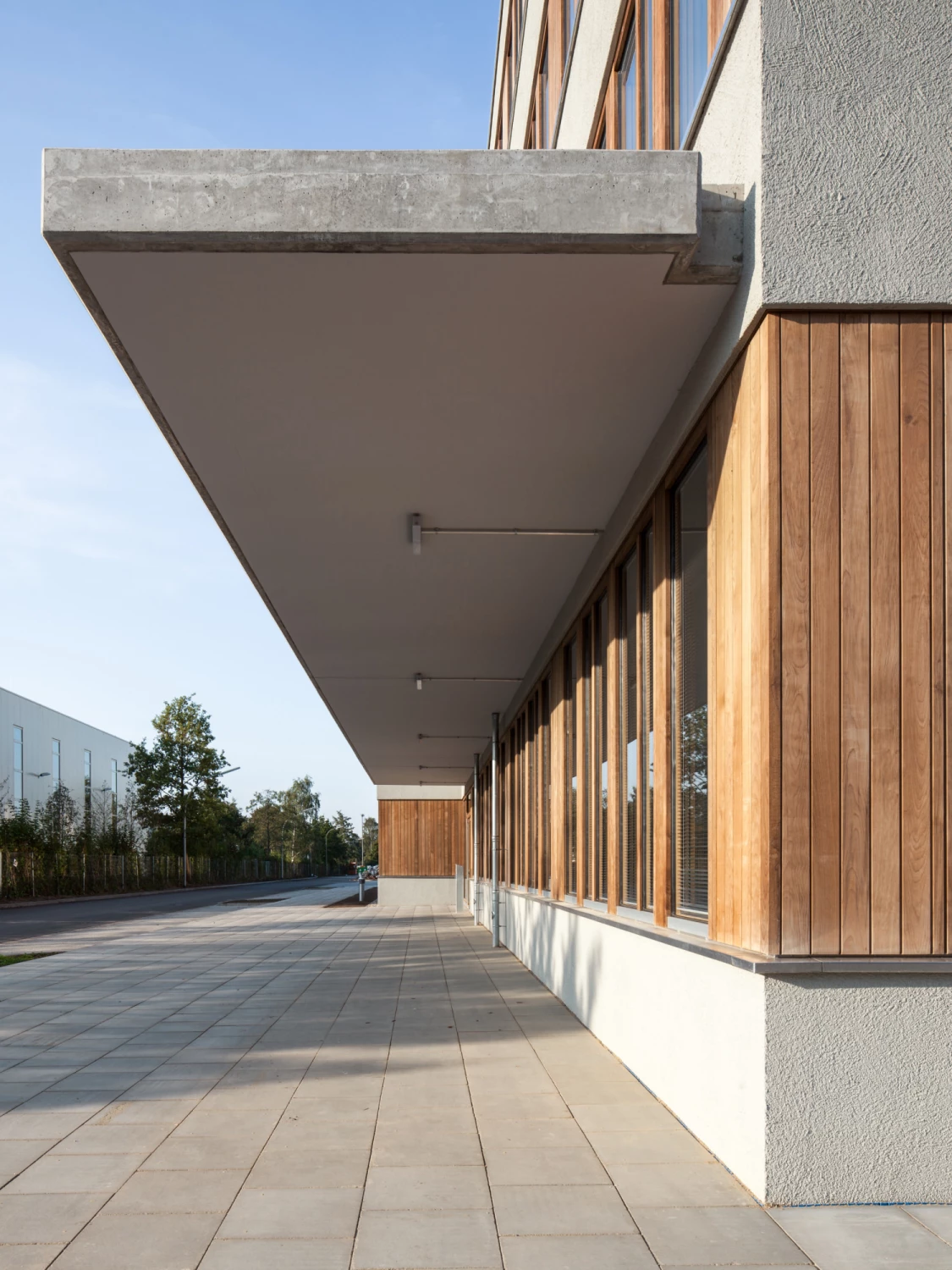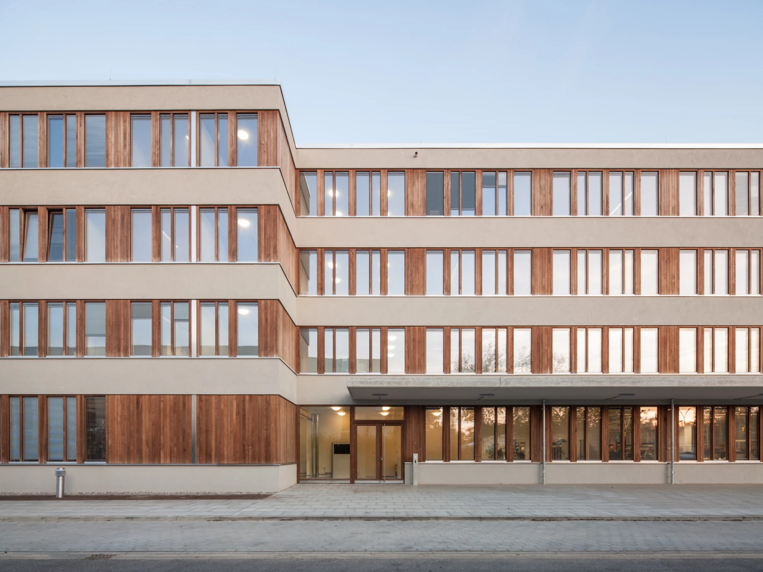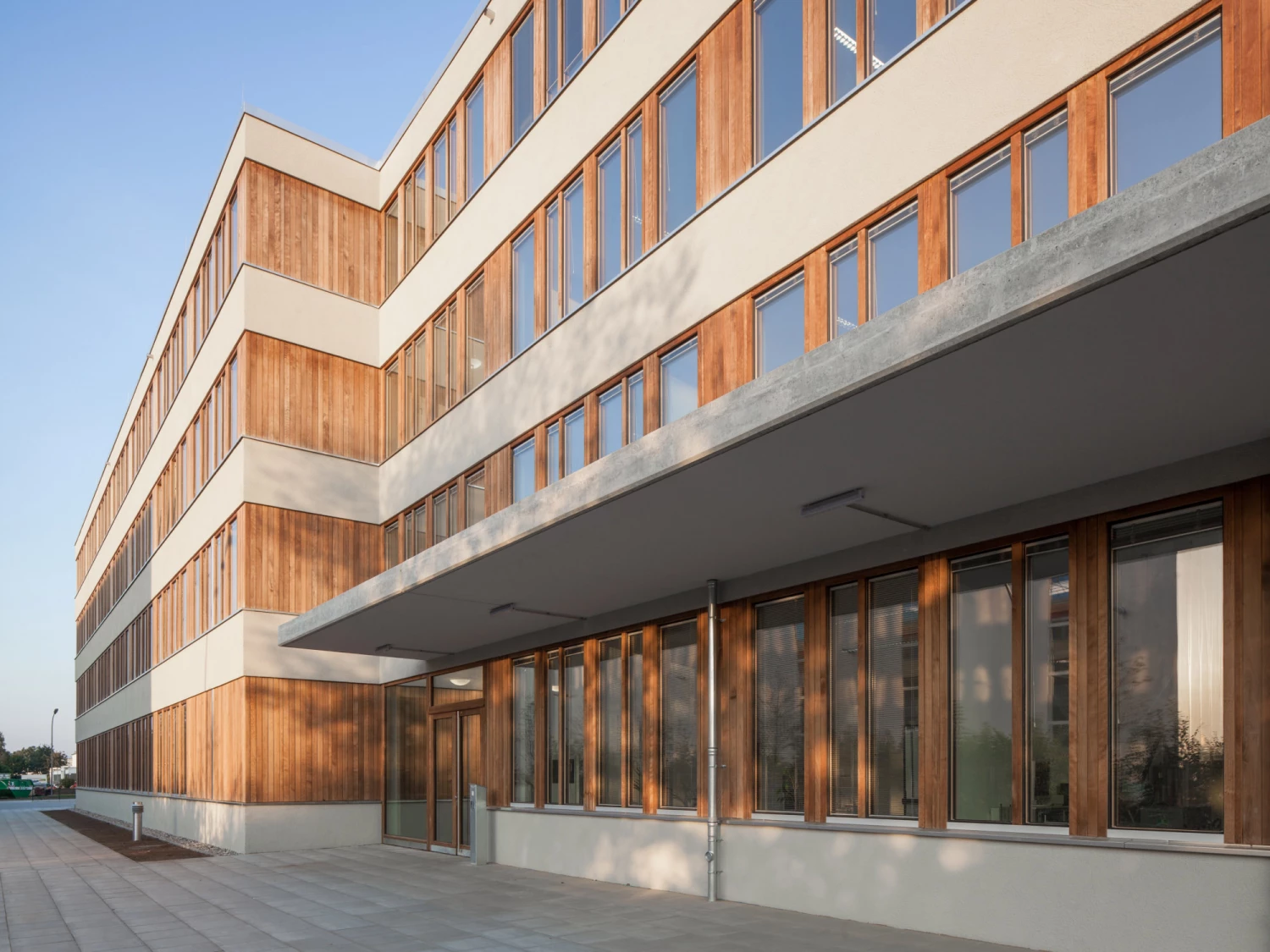 Der viergeschossige Neubau wurde vor die beiden Bestandsbauten platziert und hebt sich durch sein reduziertes Volumen und die für einen Industriebau außergewöhnliche Fassadengestaltung hervor. Der kompakte Charakter findet sich in allen Geschossen wieder: Im Erdgeschoss wurden die Produktionshalle und ein Lager untergebracht, während in den darüber liegenden Geschossen die einzelnen Arbeitsbereiche und die Haustechnik so konzipiert sind, dass eine flexible Neugestaltung der Räume jederzeit möglich ist. Bei der Fassadengestaltung entschied man sich für unbehandeltes Holz im Bereich der Fenster und für hellen Putz.