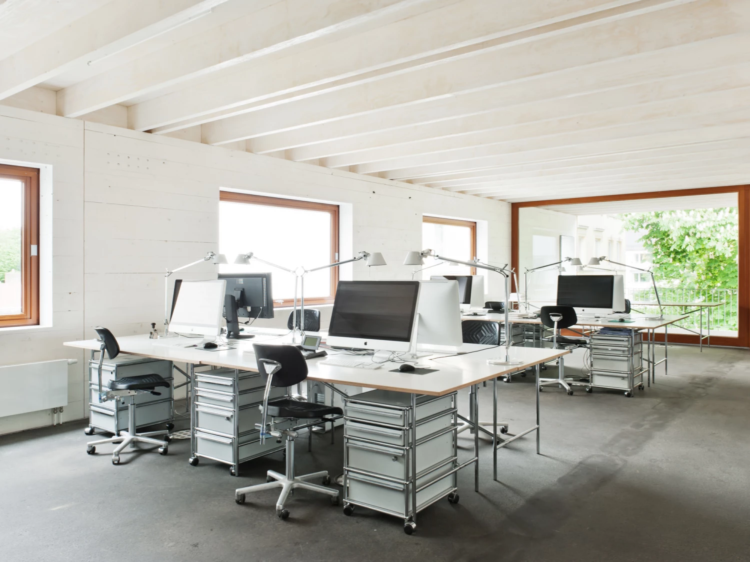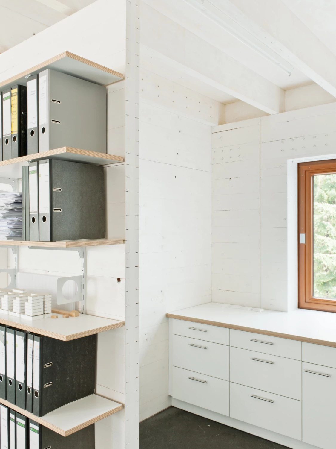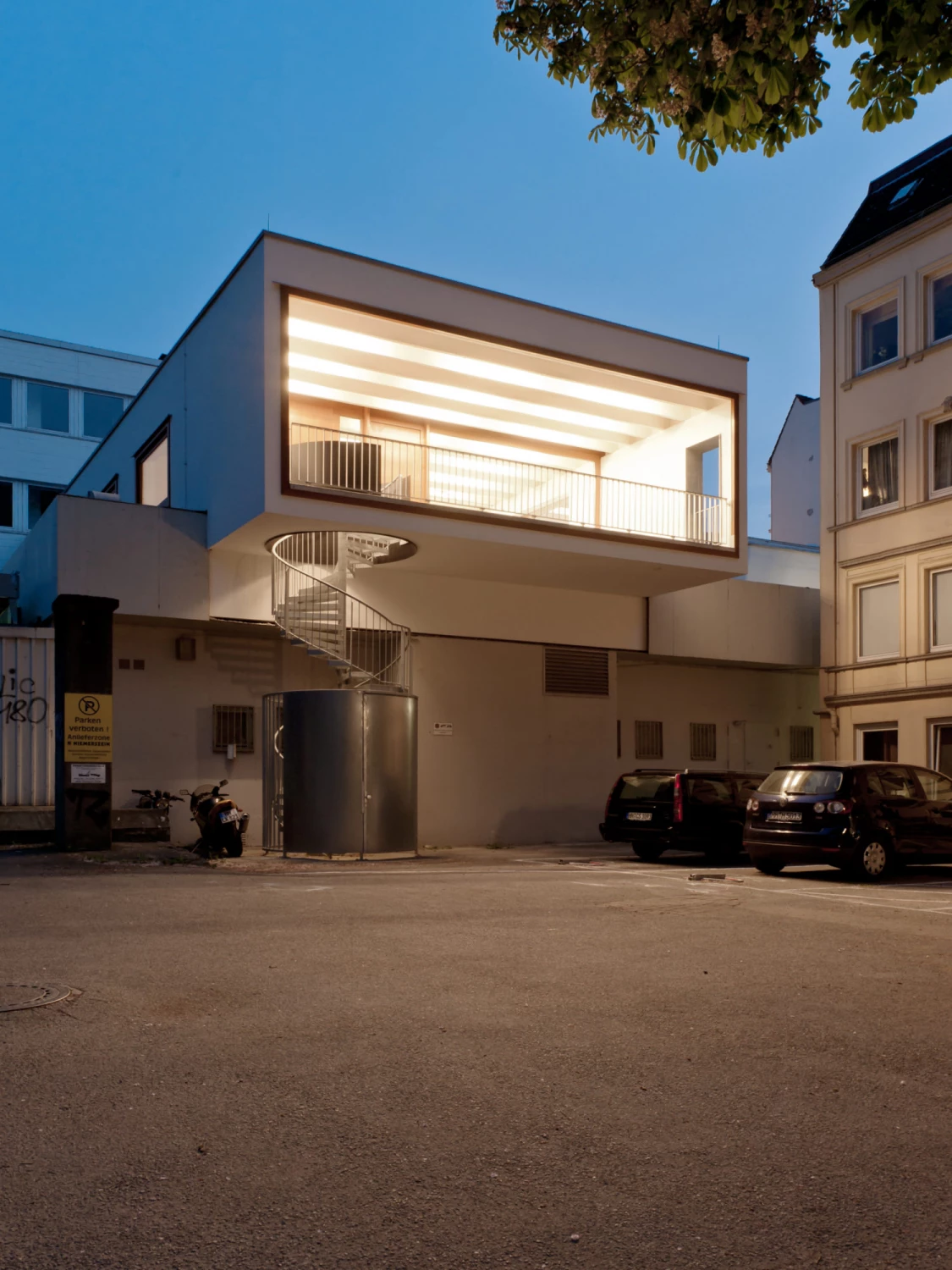 Entwickelt wurde ein 20 Meter langer und 8,80 Meter breiter, offener Baukörper, der mit seiner rohen Holzkonstruktion und frei spannenden Decke lediglich durch die Trennwände der Nebenräume ausgesteift wird. Die Räume werden durch jeweils drei an die Seiten gesetzte Fensteröffnungen sowie eine raumbreite und -hohe Panoramascheibe belichtet. Um die Holzkonstruktion so sichtbar wie möglich zu belassen, wurde bei den Ausbaudetails auf die Verwendung anderer Materialien verzichtet. Die Haupterschließung des Studios erfolgt über das Geschäftshaus.