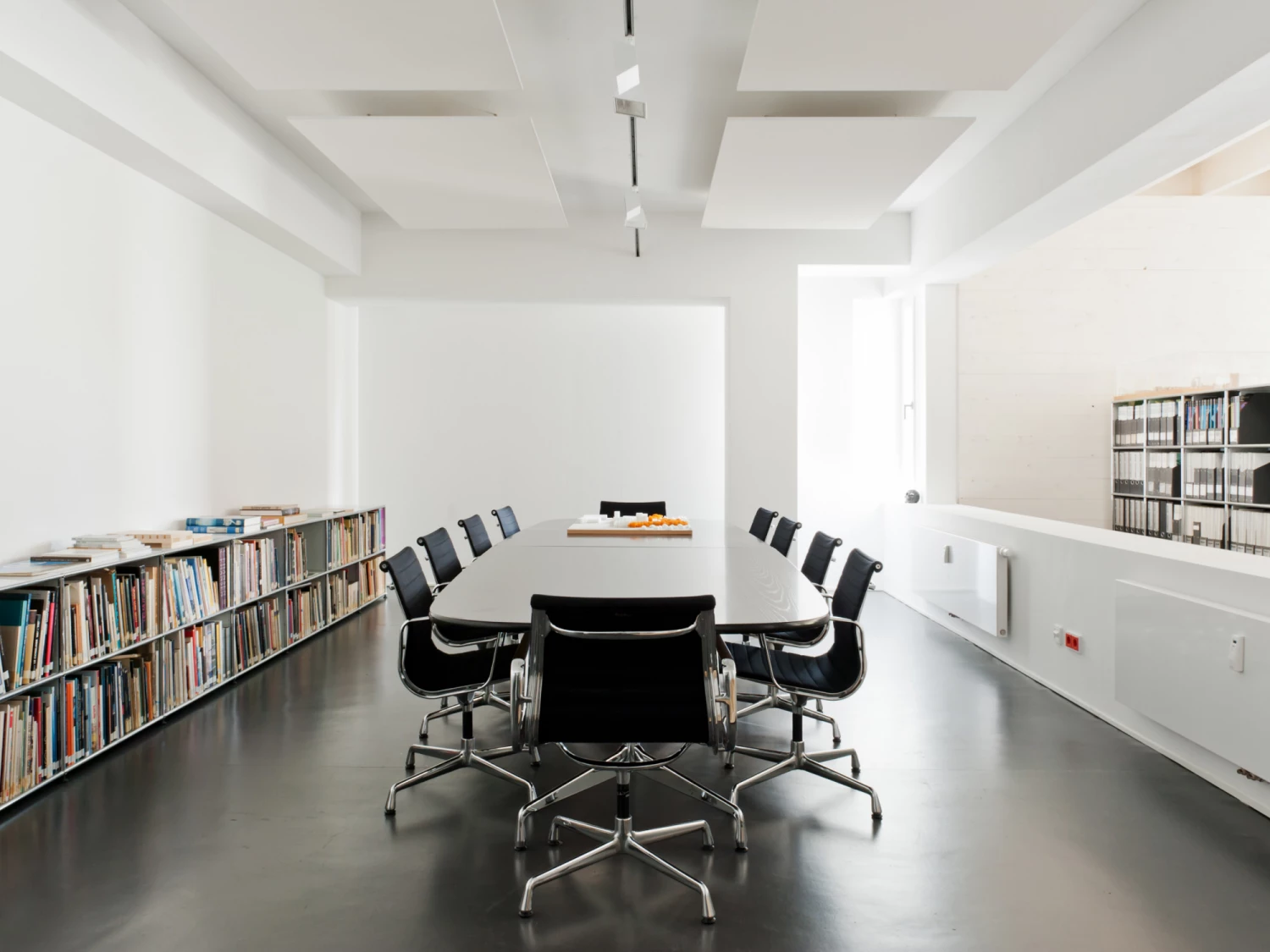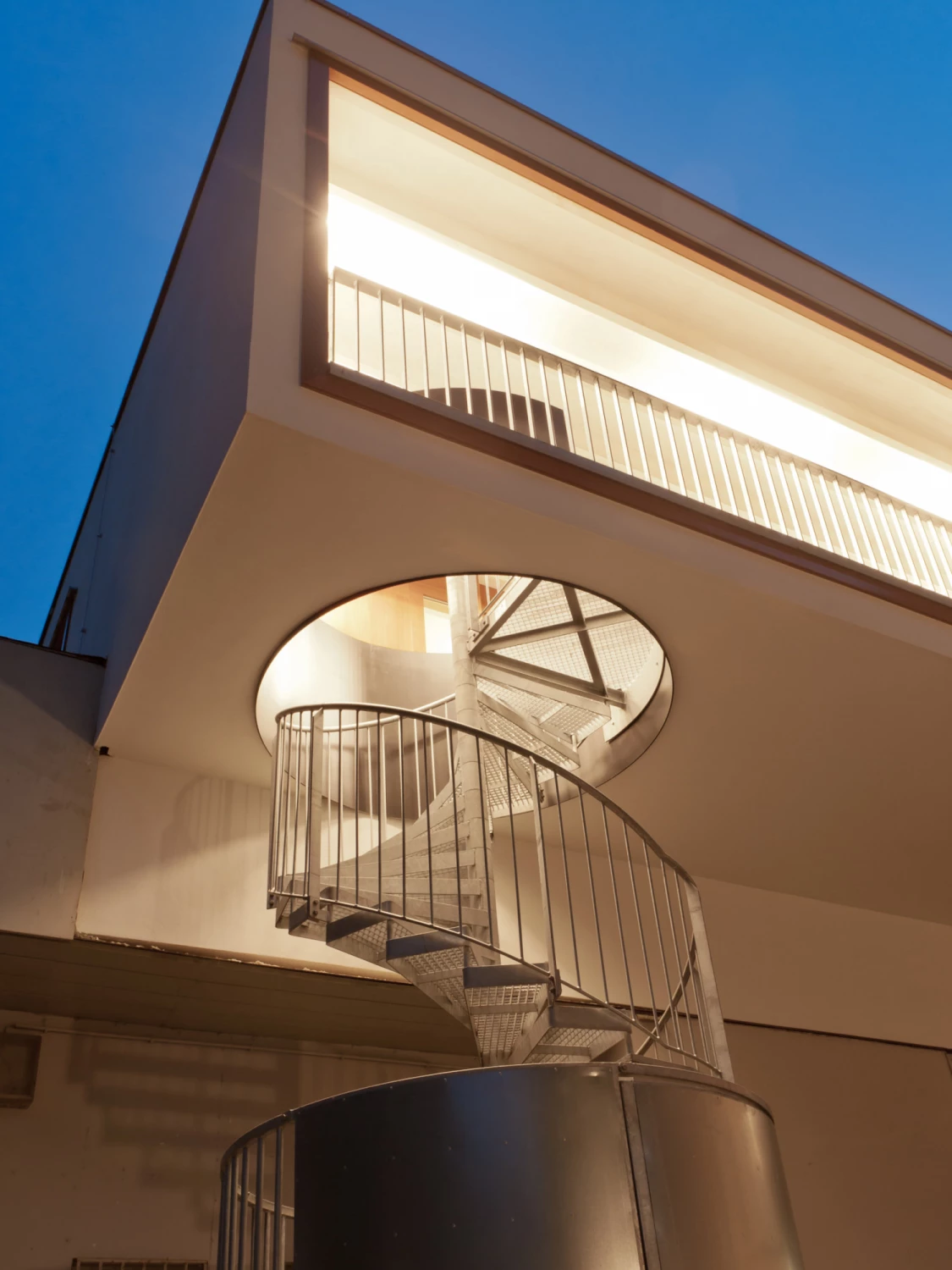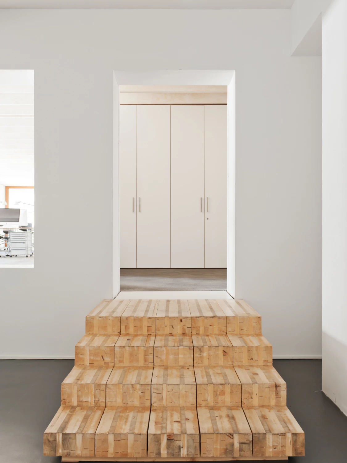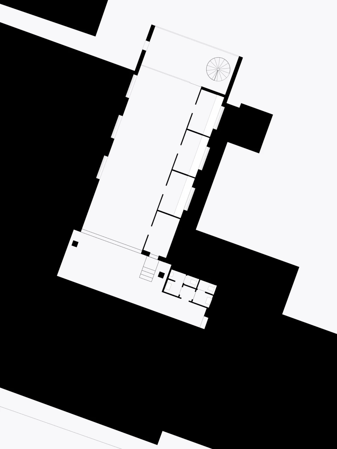 Entwickelt wurde ein 20 Meter langer und 8,80 Meter breiter, offener Baukörper, der mit seiner rohen Holzkonstruktion und frei spannenden Decke lediglich durch die Trennwände der Nebenräume ausgesteift wird. Die Räume werden durch jeweils drei an die Seiten gesetzte Fensteröffnungen sowie eine raumbreite und -hohe Panoramascheibe belichtet. Um die Holzkonstruktion so sichtbar wie möglich zu belassen, wurde bei den Ausbaudetails auf die Verwendung anderer Materialien verzichtet. Die Haupterschließung des Studios erfolgt über das Geschäftshaus.