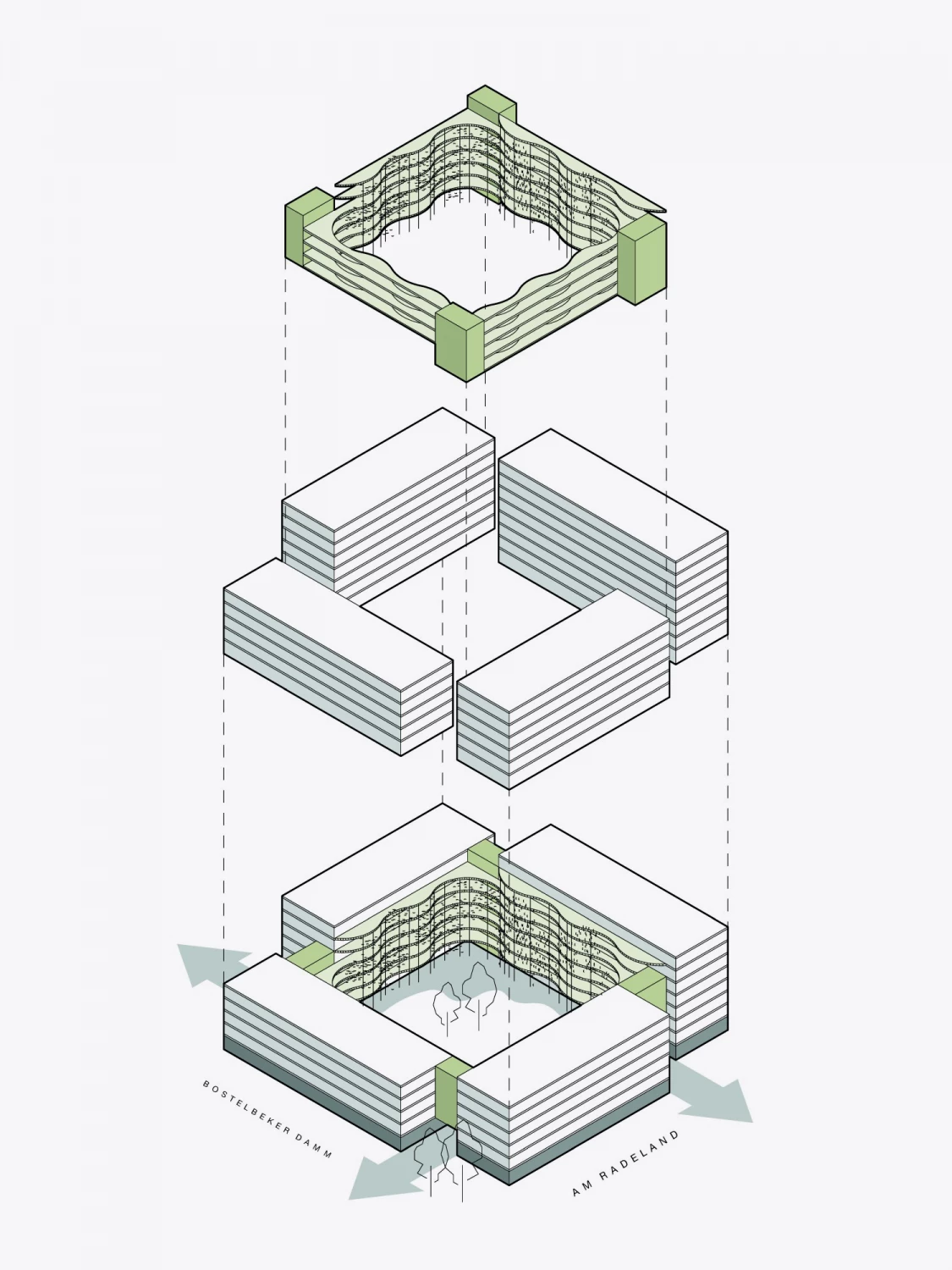 Im Hamburger Süden entsteht ein multifunktionaler Erweiterungsbau, der zeitgemäße Arbeitsplätze, Gastronomie und Hotelflächen miteinander kombiniert. Der neue Technopark verknüpft drei Gebäudeteile miteinander, die sich windmühlenartig um eine großflächige öffentliche Plaza anordnen. Diese dient zum einen als Durchwegung, zum anderen schafft das Gastronomieangebot eine Aufenthaltsmöglichkeit im Freien.